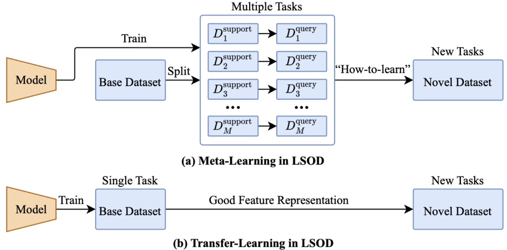 현대의 FSL은, Meta-Learning (META)과 Transfer-Learning (TL)을 접목하는 방법으로 나뉩니다. 그렇다면, META와 TL에 대해서도 알면 좋습니다. 이전 리뷰들에서 설명하였으니 이번에는 간략히 설명하자면: META는 학습하는 방법을 학습하는 메커니즘으로, 주로 전체 Base Dataset을 나누어 다수의 FSL 데이터 셋을 정의하여 모델을 학습하여 실제 FSL 태스크에 빠르게 적용할 수 있도록 하기를 목표합니다. 반면, TL은 Novel Dataset을 위해 Base Dataset을 학습 시 좋은 Representation을 획득하기를 목표로 합니다. 맨 처음 언급한 바와 같이 META는 FSL을 위해 더욱 근본적인 접근법으로 연구되고 있었으나, 2020 ECCV “Rethinking few-shot image classification: a good embedding is all you need?” 에서 TL을 활용한 접근법이 특히 Cross-Domain FSL에서 META의 성능을 앞도하는 모습을 보이며 아직 FSL을 위한 정설은 없습니다. 하지만, FSL은 이미지 분류 연구의 흐름에 따라 발달되어가는 반면, OSOL과 FSOD는 객체의 위치를 찾아야하는 문제를 포함하므로 아직 주류로 연구되고 있지는 않습니다.