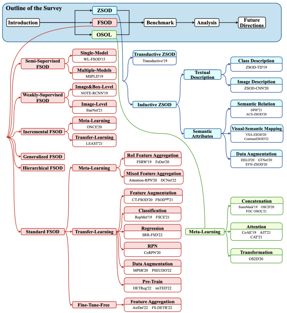 신년 세미나를 통해 Few-Shot + OD에 대한 연구 방향에 대해 말씀드렸는데, 이전 3-4편의 논문 리뷰를 보면 여전히 해당 분야에서의 성능은 좋은 모습을 보여주지 않습니다. 그러면서 Transfer-Learning, Meta-Learning 등의 다양한 접근법을 적용해보는 추세입니다. 현재까지 해당 추세가 이어져오는데, 예를 들어 Meta-Learning 방법이 Few-Shot OD의 일반적인 방법으로 받아들여질때쯤, Fine-Tuning만으로 이전의 성능을 모두 이기는 등, 다양한 관점에서 연구되며 성능이 엎치락 뒤치락 하는 모습을 보입니다. 그래서 이번에는 Survey 논문을 읽어 전체적인 흐름을 파악하고자 합니다.
