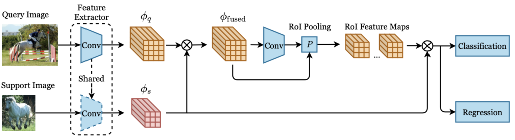 OSOL에 대한 연구가 많지는 않은편이지만, 최근의 OSOL (2021년) 연구들은 모두 META 기반의 Faster R-CNN을 활용합니다. Faster R-CNN을 활용하는 이유는 바로 위의 Potential Object에 대한 Binary Classification, 즉 RPN에서 Binary Classification을 하는 부분에 해당하기 때문이겠죠. OSOL은 보통 다음의 파이프라인으로 행해집니다. 1) 동일한 백본 네트워크로부터 Support와 Query의 Feature를 추출 2) 두 Feature map을 융합하기 위한, 연구들만의 “Feature Aggregation” 작업 수행 3) 융합된 Feature map은 RPN과 RoI Layer를 통과하여 카테고리 별 Region Proposal과 그에 해당하는 RoI Feature map 생성 4) 마지막으로, RoI Feature map은 Classification과 Regression 수행. 이 때 (Binary) Classification에서 True로 명명된 BBOX에 대한 Regression 결과 확인. 방법들도 매우 간단합니다. OSOL에 대한 정의, FSOD와의 차이점, 파이프라인 등을 알아보고자 작성하였으므로, 여태의 연구들은 아주 간단히 짚고 넘어가겠습니다.