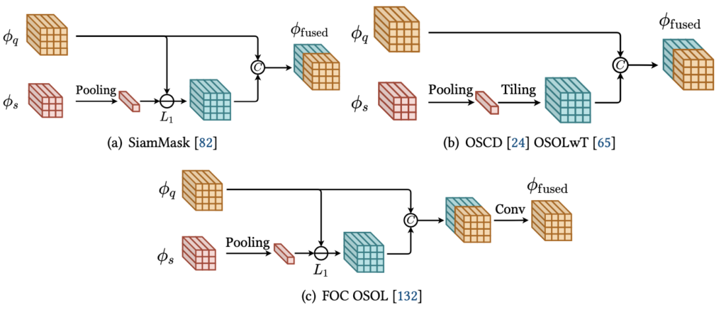 Siammask가 단순히 Pooling, 차이, Concat만으로 이루어진 단순한 구조로, 좋은 성능을 보이지 못했으며 다음으로 나온 OSCDSiamMask의 Pooling한 벡터를 Tiling한 이후 \phi_{q} 와 Concat합니다. 더 단순한 구조죠. OSOLwT, FOC OSOL와 같은 논문들도 나왔지만, 그들 또한 OSCD의 구조 뒤 Convolution Block을 쌓아 올린 것에 지나지 않습니다. 말로만 단순히 설명하여 헷갈린다고 생각 들 수 있으나, 아래의 그림을 보면 아. 정말 끝이구나 생각이 들 것 입니다.