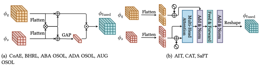 CoAE 이후의 논문 (BHRL, ABAOSOL, ADA OSOL, AUG OSOL)은 모두 Co-Attention과 Co-Excitation을 기반으로 하고 있습니다. 해당 연산이 Spatial 간 연관성 및 Long-Range Dependencies도 고려한다는 점에서, 그러면서 구현이 어렵지 않다는 점에서 높은 이점을 가지고 있습니다. 해당 Attention 외, 우리가 Attention이라고하면 가장 일반적으로 떠올리는 Transformer 기반의 Attention 연산을 활용한 OSOL 방법들도 나왔습니다 (위 Figure-(b): AIT, CAT, SaFT). 다만, 일반적인 Transformer-Based Attention 외 특이점은 없는 듯 보이네요. Attention 기반의 연산은 성능 향상에 큰 기여를 하지만, 더 좋은 Attention 연산을 위한 Transformer 기반의 방법은 많은 양의 연산량을 필요로 하는 단점이 존재합니다.