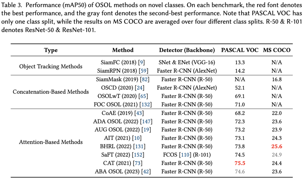 이외에도 사전학습한 TransformNet을 통해 Query와 Support 간 Spatial Align을 위한 Transformation Matrix를 구한 후, 해당 Matrix를 토대로 Query와 Support 간 4D Correlation (Query Feature map 사이즈, Support Feature map 사이즈)을 연산하는 방법도 존재합니다. 이제 OSOL을 전체적으로 요약하자면, Concatentation-Based는 구현이 쉽고, 연산량이 작은 장점이 있지만 성능이 좋지 못합니다. 반면, Attention-Based는 Query의 전경과 Support 이미지에 상응하는 연관성을 계산할 수 있다는 점에서, 좋은 성능을 보이지만 많은 연산량을 필요로하는 단점이 있죠. 바로 직전에 언급한 Transformation 기반의 방법은, 해석력이 좋아 왜 그런 결과가 나오는지에 대해 설명하기 좋지만, 큰 사전학습 모델이 필요하단 단점이 있습니다. 어느 접근법이 절대적으로 좋다고 말할 수는 없지만, 한 가지 확실한 점은 해당 태스크 자체가 현실상에서 쓸모있게 사용되긴 어려워 보입니다. 그러므로 우린 아래 Figure를 통해 성능만 간단히 살펴본 후, 다음 번에는 FSOD를 살펴보도록 하겠습니다. (기차에서 글 편집하려니 힘드네요. FSOD에 관해서는 2탄에서 찾아뵙겠습니다.)