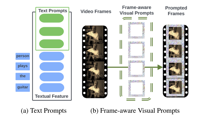 그림 2는 방금 말씀드린 visual-, text-prompt를 설명하고있습니다. 그림 2-(a)의 Text prompt는 저희 팀에서 계속 다뤘던 Vision-Language Pretraining 내지는 prompt learning 관련 리뷰에서 계속 볼 수 있었는데, 문맥을 스스로 학습할 수 있도록 text encoder로부터 추출한 text feature 앞에 learnable parameter를 붙여주고 있는 모습입니다. 반면 그림 2-(b)의 Frame-aware Visual Prompts는 조금 생소하실 수도 있지만, 결국은 프레임의 padding이 가해지는 위치에 learnable parameter를 끼워넣어주어 이를 추후 feature extraction의 입력으로 사용하는 것입니다. 목적이나 기대효과는 text prompt와 동일하다고 볼 수 있습니다.