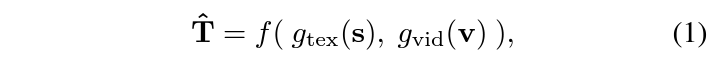 하나의 비디오 \textbf{v} \in{} \mathbb{R}^{N_{\text{vid}}\times{} C \times{} H\times{}W}, 그와 짝을 이루는 sentence \textbf{s} \in{} \mathbb{R}^{N_{\text{tex}}}가 주어졌을 때, TVG의 최종 목적은 상응하는 구간 \hat{T} = (\hat{t}_{\text{sta}}, \hat{t}_{\text{end}})를 예측하는 것입니다. 각 encoder를 g_{\text{vid}}, g_{\text{tex}}, f를 TVG method라 했을 때 전체 과정은 아래 수식 (1)과 같습니다.