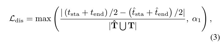결국 교집합 구간이 존재하지 않더라도 학습이 이루어지도록 하는 추가 장치들이 등장할텐데, \mathcal{L}_{\text{dis}}는 GT 구간의 중간 지점과 예측 구간의 중간 지점의 차이를 정규화 후 최소화합니다. 이는 아래 수식 (3)과 같습니다.