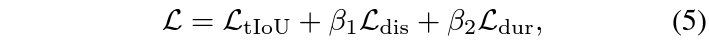 앞선 \mathcal{L}_{\text{dis}}만으로 최적화한다면 GT와의 중간 지점이 동일해지며 꽤 겹치는 방향으로 학습될 수 있지만, 구간의 중심 뿐만 아니라 길이까지 동일해야 최적의 학습이 이루어진다고 볼 수 있을것입니다. 이에 따라 아래 수식 (4)와 같은 \mathcal{L}_{\text{dur}}이 적용됩니다. 여기서 \alpha_{2}는 0.4이며 수식 그대로 두 구간의 길이를 동일하게 맞춰주는 역할을 수행합니다.