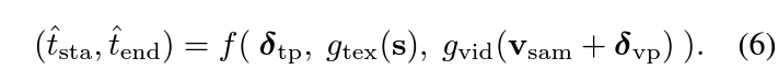 출력은 동일하게 시작, 끝 지점이며 입력값이 조금 다른 것을 볼 수 있는데요, 수식 (6)에서 \delta{}_{\text{tp}}는 text prompt, \delta{}_{\text{vp}}는 visual prompt를 각각 의미합니다. 우선 비디오로부터 uniform-sampling을 수행하여 얻은 프레임들을 \textbf{v}_{\text{sam}}이라 칭합니다. 이후 그림 2에서 보았던 것처럼 visual prompt를 적용한 뒤 visual feature를 추출합니다. 이는 text prompt, text feature와 함께 f에 입력되고 있는 것을 볼 수 있습니다.