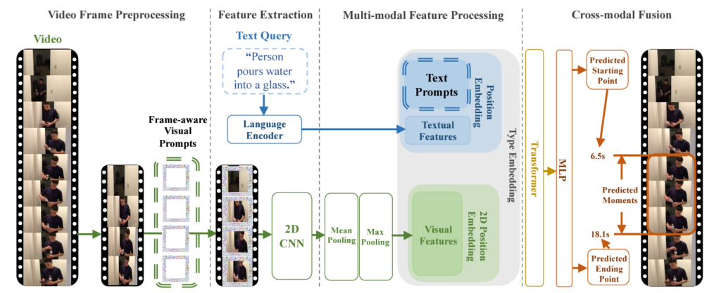 저자는 2D TVG 베이스라인으로 ClipBERT를 선택하였습니다. 기본적인 파이프라인을 ClipBERT로 두고 이에 저자가 제안하는 prompt 기법을 추가하는 것입니다. 그림에서 볼 수 있는 4가지 단계는 아래와 같습니다. 이들이 본 방법론에 특화된 4가지 구분이라기보단, TVG의 일반적인 파이프라인이라고 생각하시면 됩니다.