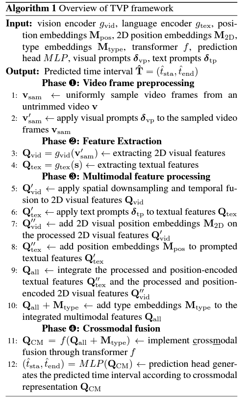 3, 4단계에서 두 모달의 feature enhancement가 이루어지기 때문에 사실상 TVG에서 가장 중요한 부분입니다. L5에서는 Pixel-BERT에서의 방식을 따라 앞서 얻은 \textbf{Q}_{\text{vid}}에 2\times{}2 max-pooling과 시간 축에 대한 average-pooling을 적용해 \textbf{Q}'_\text{{vid}}를 얻습니다. L6에서는 앞서 얻은 text feature Q_{tex}에 text prompt \delta{}_{\text{tp}}를 붙여 \textbf{Q}'_{\text{tex}}를 얻어줍니다. 이후 L7, L8에서는 각 모달 feature에 positional embedding을 더해 \textbf{Q}''_{\text{vid}}, \textbf{Q}''_{\text{tex}}를 얻습니다.