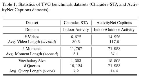 표 1을 통해 두 데이터셋의 일반적 통계량을 살펴볼 수 있는데, Charades-STA보다는 ActivityNet Captions의 비디오 개수, 각 비디오 당 길이, text query에 상응하는 moment의 개수 및 길이, 주어지는 query의 개수와 각 query의 길이 모두가 많거나 긴 것을 볼 수 있습니다. 저자도 다른 방법론들과의 비교를 위해 두 데이터셋으로 벤치마킹을 수행하고 있습니다.