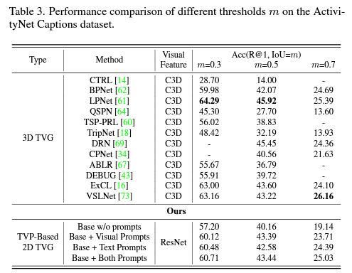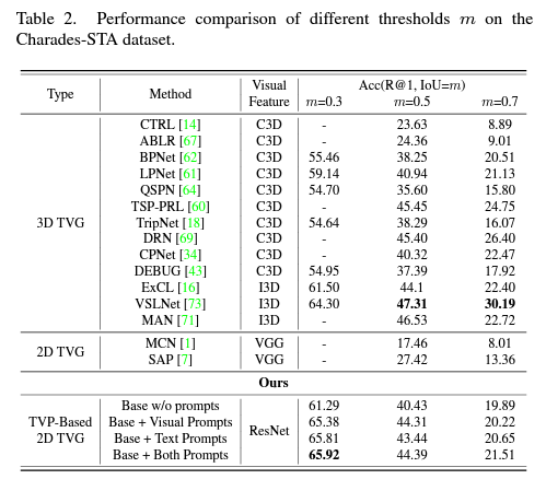 - We integrate visual prompt with text prompt to co-improve the effectiveness of 2D visual features. On the top of that, we propose TDIoU-based prompt-model co-training method to obtain high-accuracy 2D TVG models.