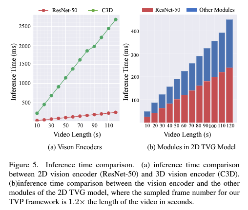 사실 성능-inference time 간 trade-off 관계에서의 간극을 메웠는지 봐야하기 때문에, 위 그림 5에 나타난 각 model의 inference time도 함께 비교해보아야 할 것입니다. Inference time은 비디오에 대한 feature extraction 시간 + 예측을 수행하기 위한 TVG module 시간으로 나눠볼 수 있습니다. 저자에 따르면 2D model이든 3D model이든 feature extraction 시간이 전체 inference time의 절반 이상을 차지한다고 합니다. 이 와중에 3D model의 feature extraction 시간이 2D model의 feature extraction 시간보다 5배 이상 길며, 3D model의 feature extraction만 수행해도 2D model의 모든 inference를 마칠 수 있을만큼 긴 시간이 수반된다고 합니다.