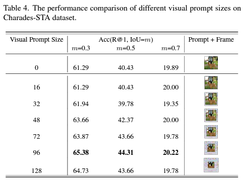 다음으로 표 4, 5는 각각 Visual Prompt의 크기와 Text Prompt의 크기에 대한 ablation 실험입니다. 앞서 detail을 설명드릴 때 visual prompt가 프레임의 가장 자리에 어떻게 들어가는지 쉽게 그려지지지 않는 분들이 계실 것이라 생각했는데, 이에 대해서는 그림 4를 보시면 될 것 같습니다.