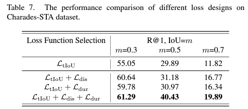 마지막으로 loss ablation 성능만 살펴보고 마무리하겠습니다. TDIoU loss보다는 prompting 부분이 핵심 contribution이라 생각했기에 큰 성능 향상을 기대하지 않았는데, 위 표 7을 보니 두 loss \mathcal{L}_{\text{dis}}, \mathcal{L}_{\text{dur}}이 베이스라인 대비 굉장히 큰 성능 향상을 불러왔음을 알 수 있습니다.