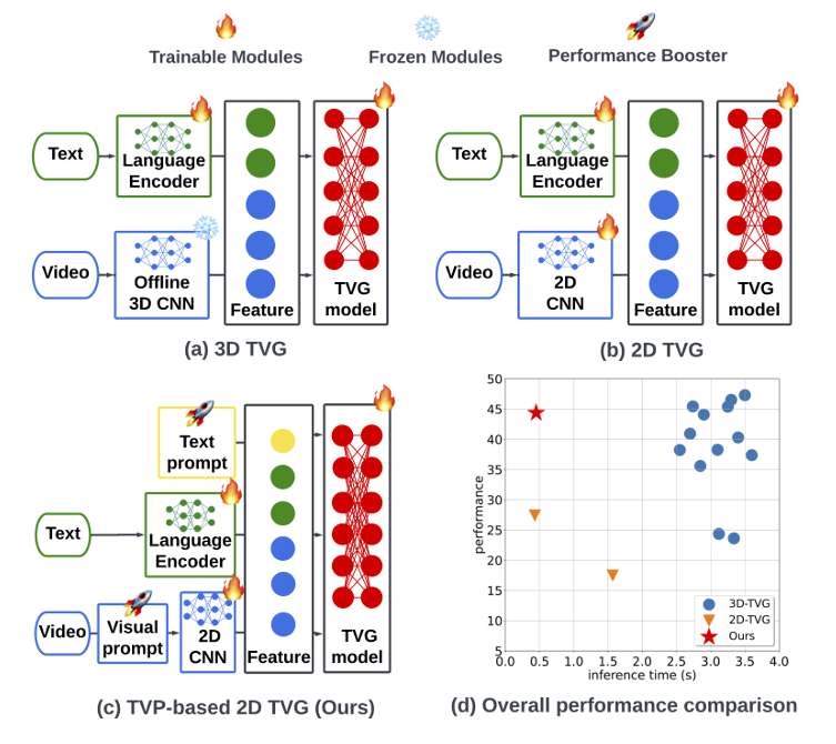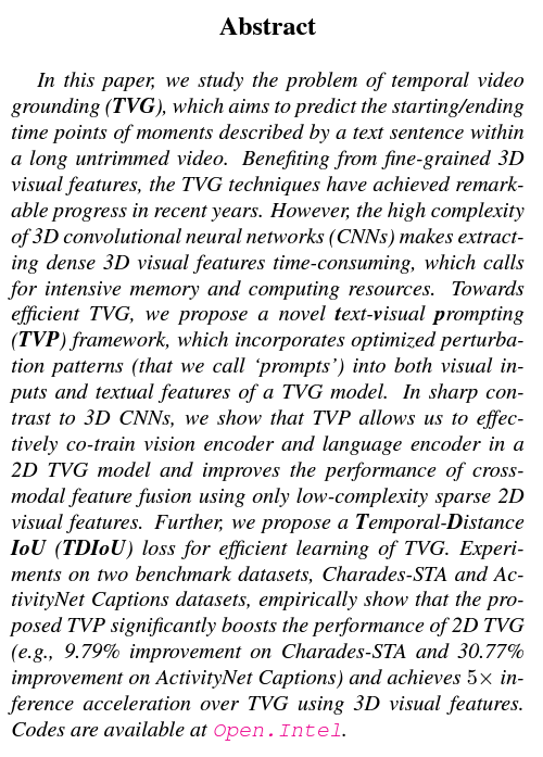 - We propose an effective and efficient framework to train 2D TVG models, in which we leverage TVP to improve the utility of sparse 2D visual features without resorting to costly 3D features.