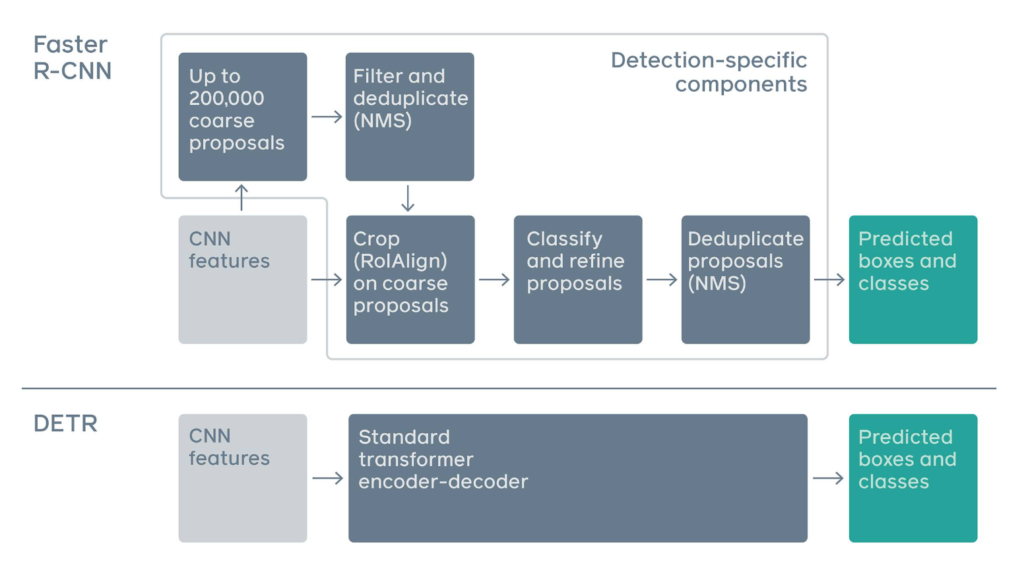 본 연구는 진짜 End-to-End Object Detection 을 제안합니다. 미분 불가능한 연산은 일체 존재하지 않는 DETR(DEtection TRasnformer)을 제안합니다. 우선 기존 Faster RCNN과 이번에 제안하는 DETR의 전체적인 흐름을 한번 비교해보도록 하겠습니다.