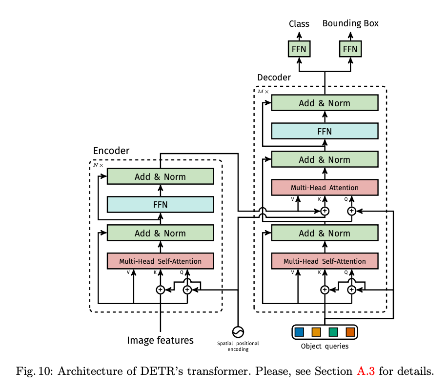 우선 Transformer의 Decoder에서 Key, Value 값을 encoder의 출력으로 활용합니다. Key와 Value는 이미 앞선 CNN feature 들 끼리의 dependency가 녹아져 있는 정보라 볼 수 있습니다. 이를 바탕으로 N개의 Object를 가정하고 복호화를 시도해야 합니다.