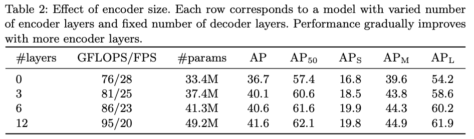 Encoder를 아예 사용하지 않은 상황에서 Layer의 갯수를 늘려가며 비교한 실험 입니다. 전체적인 AP에서는 3.9 drop이 발생하고 large 상황에서는 6.0 drop이 발생하고 있습니다.
