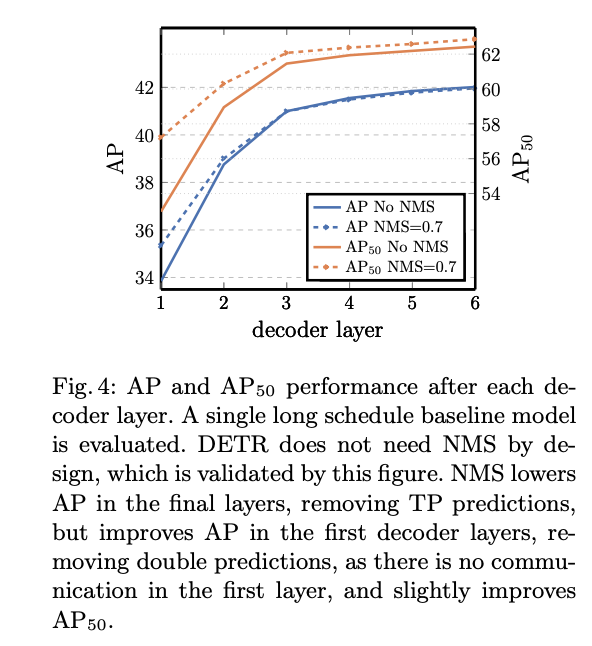 Decoder layer가 적을 때는 물체들을 잘 구분을 못해서 하나의 물체에 여러개의 예측을 하려고 하는 경향을 보입니다. 즉, NMS를 통해 성능 이득을 보는 것이죠.