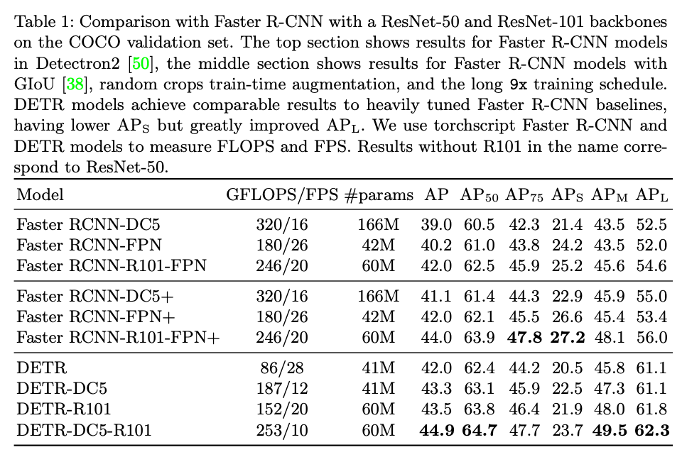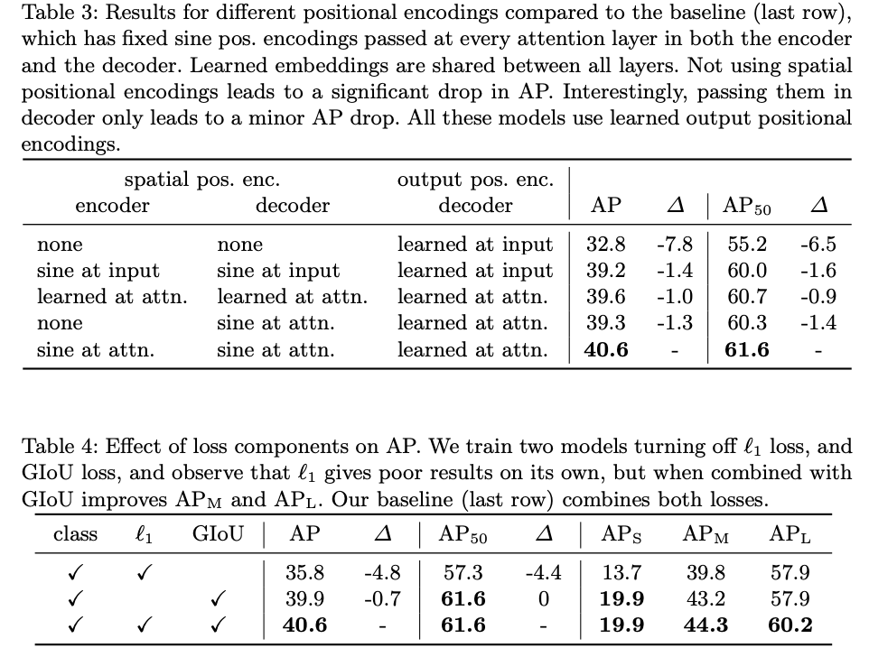이 때 dilation convolution을 사용한 성능이 DC5로 표기되어 있습니다. 최종적으로 DETR-DC5-R101의 경우 \text{AP}_{75}나 \text{AP}_{S}를 제외하고는 모두 기존 베이스라인 대비 좋은 성능을 보여주고 있습니다.