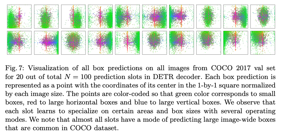 이 때 각 object query는 특정한 박스 크기에 대해 예측을 수행하며, 학습된 query가 object의 위치에 따라 다양하게 반응하는 모습을 보여주고 있습니다.