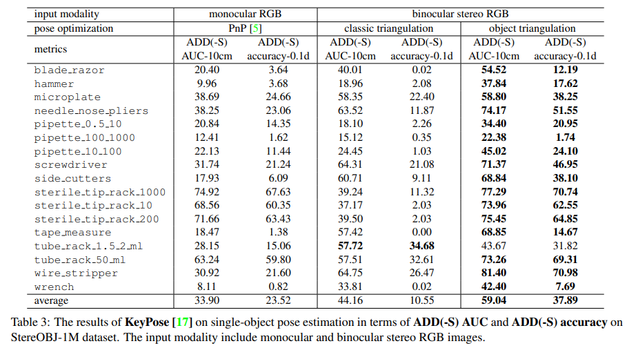KeyPose에 대해서 stereo의 입력이 아니면 동작하지 않을 줄 알았는데 왼쪽 이미지만 입력으로 사용하여 monocular 이미지에 대한 실험을 진행할 수 있었다고 합니다. keypoint에 대한 히트맵을 사용하여 예측하고 마지막으로 PnP를 통해 최종적인 6D pose를 구합니다. 해당 결과는 표(3)의 1-2열을 참고하시면 될 것 같습니다. 성능면에서는 mono에 대한 성능면에서 비슷한 결과를 보면 특히 pipette 물체에 대해 매우 성능이 떨어지는 것을 확인할 수 있는데 이는 시각적으로 유사하지만 실제로는 서로 다른 물체의 pose를 추정하는 것이 실제로는 어려운 것임을 입증할 수 있는 결과입니다.