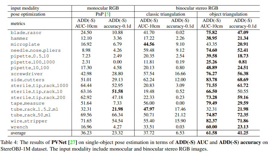 여기서는 Stereo에 대한 성능을 뽑기 위해 PVNet에 개별적으로 예측된 keypoint에 대해 stereo에 맞게 조정이 된다고 합니다.triangulation 을 이용하면 두 카메라 사이의 기하학적인 관계를 이용하기 때문에 예측된 keypoint에 대해 3D 위치가 조정이 된다는 의미인 것 같네요.