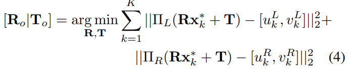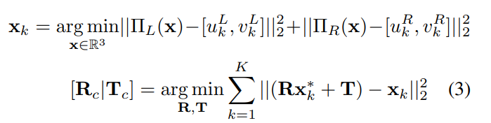 식(3)의 x_{k}가 triangulation을 진행한 k번째 3D 포인트의 위치를 나타냅니다. 최적화 과정인 OPP를 적용하기 위해 \Pi는 좌우에 대한 카메라에 대한 projection을 의미하며 여기서 예측된 2D keypoint를 각각 빼주어 최적화 과정을 진행하고 앞선 평가지표인 ADD에 따라 최종적으로 R, T값을 도출하게 됩니다.