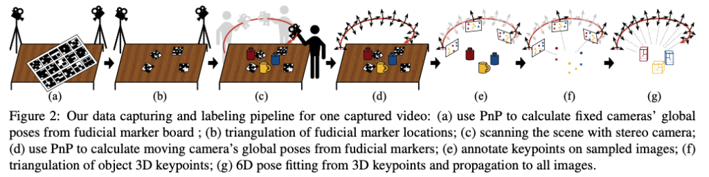 이러한 문제들을 저자는 multi-view 기하학을 기반으로 마커보드, 카메라, 물체에 대한 keypoint를 정확하게 찾아내는 파이프라인을 구성하여 데이터셋을 구축합니다.