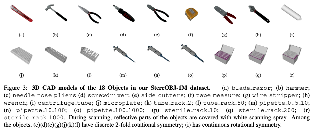 해당 데이터셋에는 총 18개의 물체들로 구성되어있습니다. 그 중에 10개(그림(3)(i) ~ (r))는 바이오케미컬 분야에서 사용되는 플라스틱 기구들로 이루어져있으며, 나머지 8개는 공구로 구성되어 있는 것을 확인할 수 있습니다. 해당 물체들을 보면 앞서 저자가 지적한 기존의 물체들의 구성에 대한 한계인 투명하거나 반사가 잘 되는 물체들도 구성한 것을 볼 수 있네요. 해당 논문에서 사용한 스캐너는 EinScan Pro 2X Plus 모델인데 찾아보니 약 1000만원이 조금 안되는 모델이었습니다. 저희가 업체에 맡긴 스캐너의 가격은 찾아보니 1억정도 하는 모델이네요.. 1000만원 스캐너로도 저런 퀄리티가 나오는구나 생각이 들었습니다. 반사가 심한 메탈 재질들에 대해서는 흰 스프레이를 뿌려서 스캔을 진행했다고 합니다.