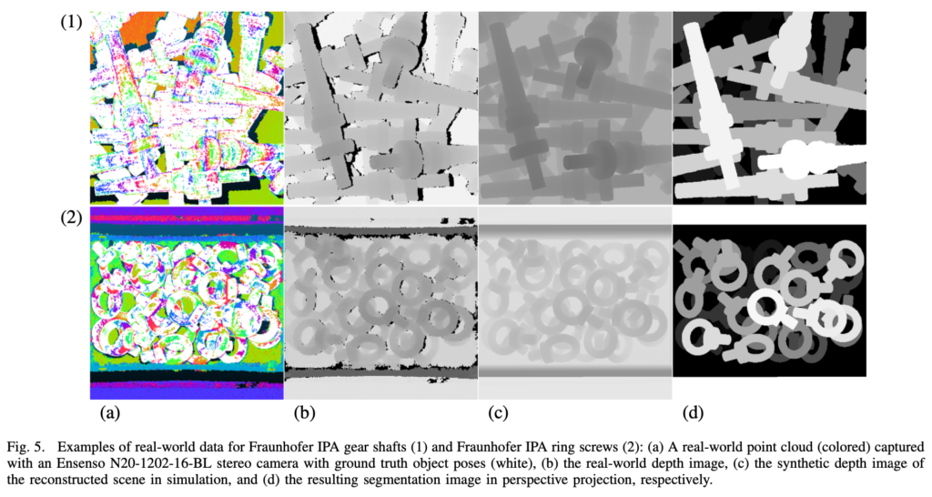 그림(5)와 같이 gear shaft와 ring screw에 대해 각각 (a)colorized point cloud, (b)real depth (c) synthetic depth (d) segmentation 순으로 구성되어 있는 것을 확인할 수 있습니다. 이처럼 얻어진 6D pose를 바탕으로 시뮬레이터를 이용하여 물체에 대한 visibility score까지 결정할 수 있다고 합니다. 또한 각각의 물체에 대한 실제 depth와 합성 depth를 통하여 annotation 과정에 대한 결과를 입증할 수 있다고 합니다.