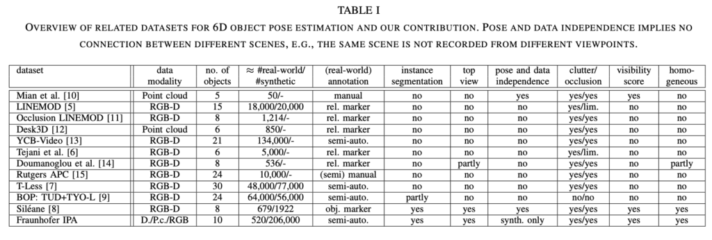 Desk3D, YCB-V, [6], [14]는 동일한 장면을 다른 시점에서 촬영을 했기 때문에 pose의 변화가 제한적이며 데이터의 중복성이 있습니다. 또한 bin-picking을 다루는 것은 [14]에서 말고는 없었다고 하네요.