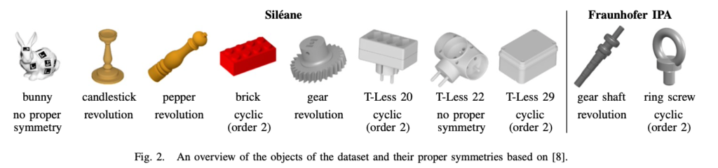 이번 데이터셋은 [8]의 데이터셋과 다른 8개의 대칭 물체들을 다루었고 [7] 데이터셋에서 사용한 물체를 그대로 사용했다고 합니다. 해당 데이터셋에서 새롭게 추가된 산업용 물체는 2가지인 것 같습니다. 해당 물체들은 revolution에 대한 대칭을 가지는 gear shaft와 cyclic에 대한 대칭을 가지는 ring screw를 의미합니다.