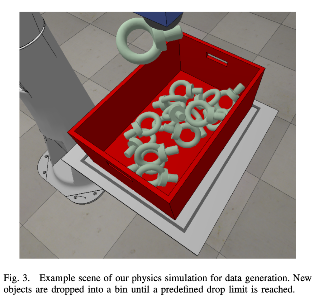 그림 (3)과 같이 해당 데이터셋에서 사용하는 ring screw에 대해서 해당 시뮬레이터를 사용한 모습을 보여줍니다. 각 물체들의 3D 모델을 넣어 다양한 위치에서 임의의 방향으로 bin에 넣는식으로 진행했다고 합니다. 자동제어나 동역학을 수강하신 분들은 아시겠지만, 로봇팔과 같은 메니퓰레이터를 사용하는 것은 소프트웨어로만 움직이는 것이 아니라 동역학과 같은 물리적으로 생길 수 있는 영향에 대해 고민을 해야하는데요. 대표적으로 충돌에 대한 고려를 해야합니다. 외부 물체로부터의 충돌도 있겠지만 로봇팔이 움직이면서 self-collision과 같은 문제가 발생할 수 있기 때문에 참고하시면 좋을 것 같습니다. 저자는 이러한 충돌 문제를 다루기 위해 내장된 Bullet이라는 물리엔진을 사용했다고 합니다. 논문에 불릿이라는 물리 엔진을 설명하면서 링크를 Pybullet을 걸어줬는데요. 메인에 보이는 KUBRIC이라는 데이터셋 generator가 눈에 띄네요. 보니 구글에서 만든 툴 같은데 참고하면 좋을 것 같습니다.