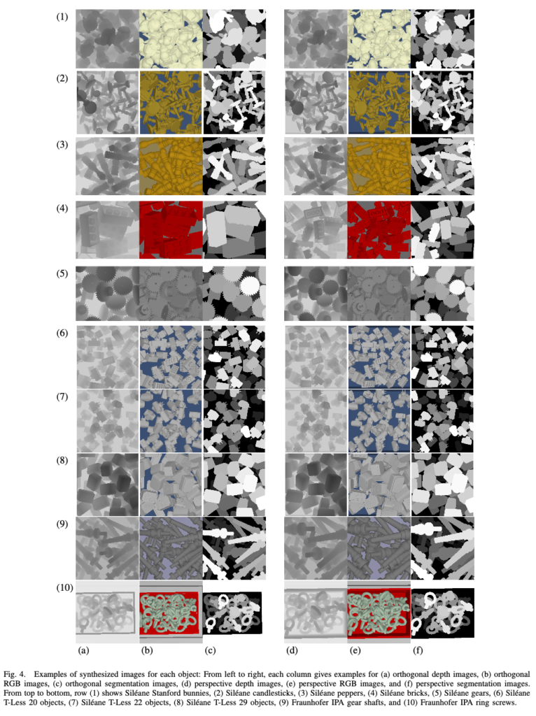 그림 (4)는 한 페이지를 차지할 정도로 되게 크네요.. 해당 그림은 저자가 새롭게 추가한 물체에 대한 현실성을 높이기 위해 기존의 사용하던 물체에 대한 파라미터는 바꾸지 않고 않았으며 bin의 pose만 조금씩 바꿔가면서 데이터를 취득했다고 합니다. 빈 bin에서부터 시작해서 물체의 개수를 조금씩 늘려주는 식으로 반복적인 과정을 진행하는데요. 정리하자면 첫 번째 물체 1개를 넣고 비우고 두 번째에는 물체 2개를 넣는식으로 진행하는 식으로 반복적인 과정을 진행하면서 모든 물체들의 pose와 RGB, depth, segmentation에 대해 모두 취득하고 해당 과정은 사전에 정의된 한도 사이클을 도달할 때까지 진행합니다. 그림 (4)는 모든 사이클을 다 돌았을 때에 대한 그림이라고 이해해주시면 되겠습니다. visibility score는 어떻게 계산되는 건지 궁금했는데, 이는 segmentation에 의존적으로 계산되는 것 같습니다. 대상이 되는 물체가 전체 중 어느정도로 보이는지에 대해 계산하는 것 같은데 논문에는 해당 내용에 대해 자세한 설명이 없네요.