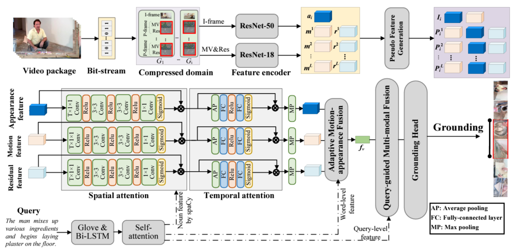 그림 1-(b)를 보시면 기존 방법론들과 다르게 본 논문의 방법론은 압축된 비디오가 코덱을 거쳐 원본 프레임으로 압축 해제되기 이전의 정보들을 grounding에 활용하고 있는 모습입니다. 이렇게되면 압축 해제된 원본 비디오보다 정보량 측면에서 손해를 볼텐데, 이렇게 효율성을 고려했음에도 성능은 기존 방법론들보다 좋았기에 CVPR에 게재될 수 있었던 논문입니다.