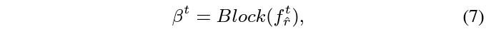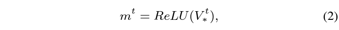 Appearance 정보가 없다고 볼 수 있는 P-frame의 appearance 정보를 추정하였으니, 반대로 motion 정보가 없다고 볼 수 있는 I-frame의 motion 정보도 추정해주어야 합니다. 수식 1에서 얻은 nrodml P-frame의 appearance feature a를 모두 concat하여 V^{t} = [a^{t}; \cdots{} ; a^{n+t}] \in{} \mathbb{R}^{H \times{} W \times{} C \times{} n}을 만들어주고 이에 1\times{}1 Conv를 적용하여 얻은 V_{*}^{t}에 대해 아래 수식 (2)를 적용하여 I-frame의 motion vector m^{t}를 얻을 수 있습니다. 결론적으로 현재 I-frame을 참조하는 모든 P-frame의 appearance 정보에 1\times{}1 Conv + ReLU를 적용한 것이라고 볼 수 있습니다.