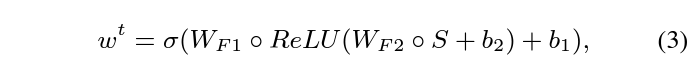 앞서 spatial modeling이 완성되었다면, 해당 feature에 대한 temporal modeling도 수행됩니다. 여기서도 결국은 temporal 정보를 고려한 attention score w를 만들어주는 것이 목적입니다. 우선 appearance feature만을 기준으로 설명드리면, I-frame으로부터 연속되는 K개의 프레임들을 고려해 temporal attention score를 만들어냅니다. 현재 보고있는 t번째 I-frame으로부터 K개의 프레임에 대한 appearance feature를 모두 concat해주고, average pooling을 거쳐 K차원의 attention score S를 만들어줍니다. 이후에는 아래 수식 3을 통해 w가 생성됩니다.