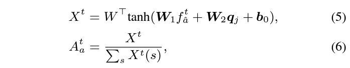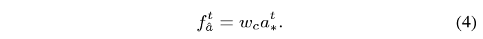 이후에는 수식 4와 같이 element-wise multiplication을 통해 f_{\hat{a}}^{t}, f_{\hat{m}}^{t}, f_{\hat{r}}^{t}를 얻어줍니다. 이 3가지 feature들이 spatial-temporal attention modeling을 마친 feature들이라고 볼 수 있습니다.