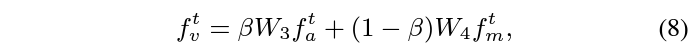 여기서는 쿼리 단어에 맞게 appearance, motion feature 둘을 어떻게 합칠지, 즉 balancing weight \beta{}를 추출하는 것이 목적입니다. 이 과정은 위 그림 3과 아래 수식 7, 8을 통해 확인할 수 있습니다.