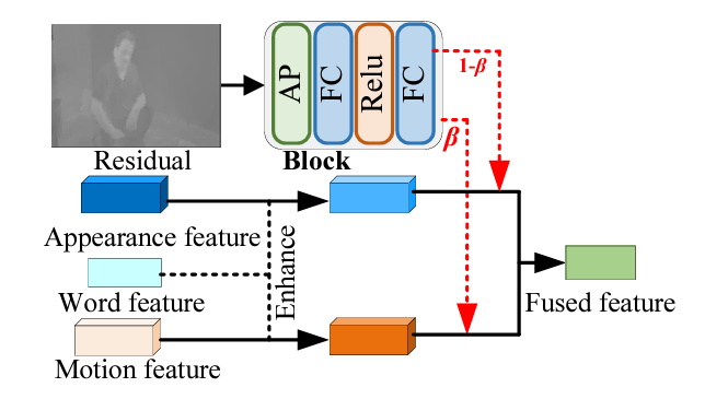 앞서 feature를 얻었으니, 이를 쿼리와 관련된 구간 예측에 사용하면 됩니다. 그 이전 조금 더 activity content와 관련된 모델링을 수행하기 위한 모듈이 Adaptive Motion-Appearance Fusion인데요, 비디오에는 다양한 temporal change가 존재합니다. 이는 주어지는 text 쿼리로부터 정보를 얻어볼 수 있는데, 예를 들어 “run”이라는 단어와 “walk”라는 단어가 존재할 때 “run”의 경우는 빠르게 변화하므로 appearance feature의 가중치를 더 높게, “walk”의 경우는 motion feature의 가중치를 더 높게 주어 fuse 해야합니다. 이를 위해 먼저 쿼리를 기반으로 appearance, motion 정보를 enhance해주고, residual feature를 기반으로 두 정보의 balancing weight를 추출합니다.