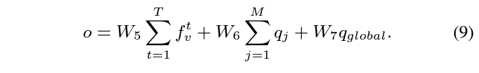 수식 9의 출력인 o는 grounding에 활용될 multi-modal feature입니다. 마찬가지로 linear projection의 연속이며, 아까 추출했던 sentence-level feature q_{global}도 함께 사용되고 있습니다.