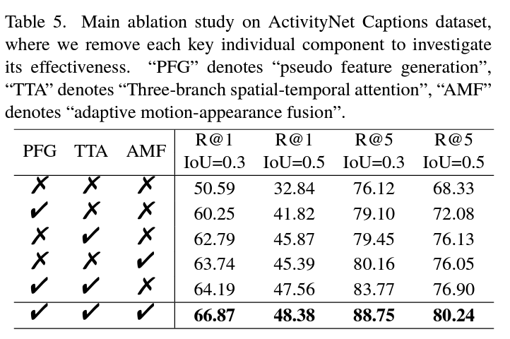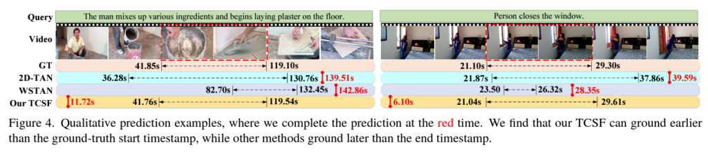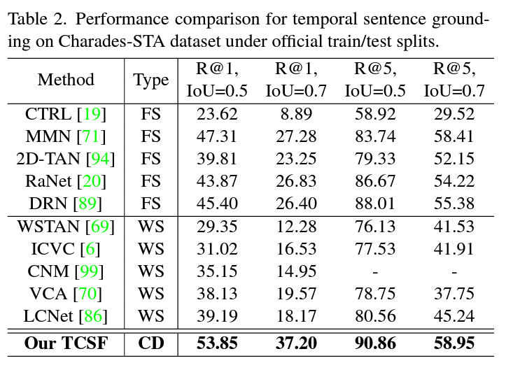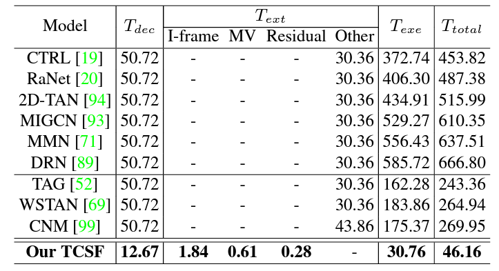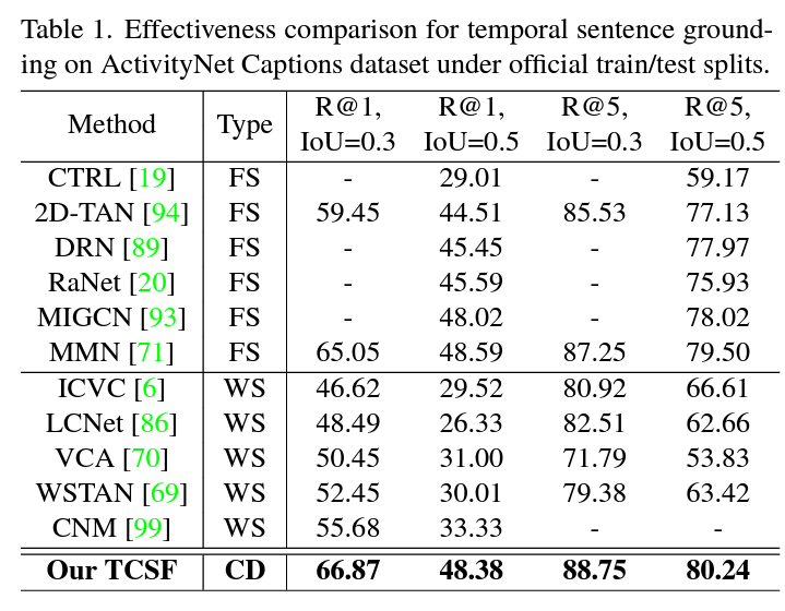 - Extensive experiments on three challenging datasets(ActivityNet Captions, Charades-STA and TACoS) validate the effectiveness and efficiency of our TCSF.