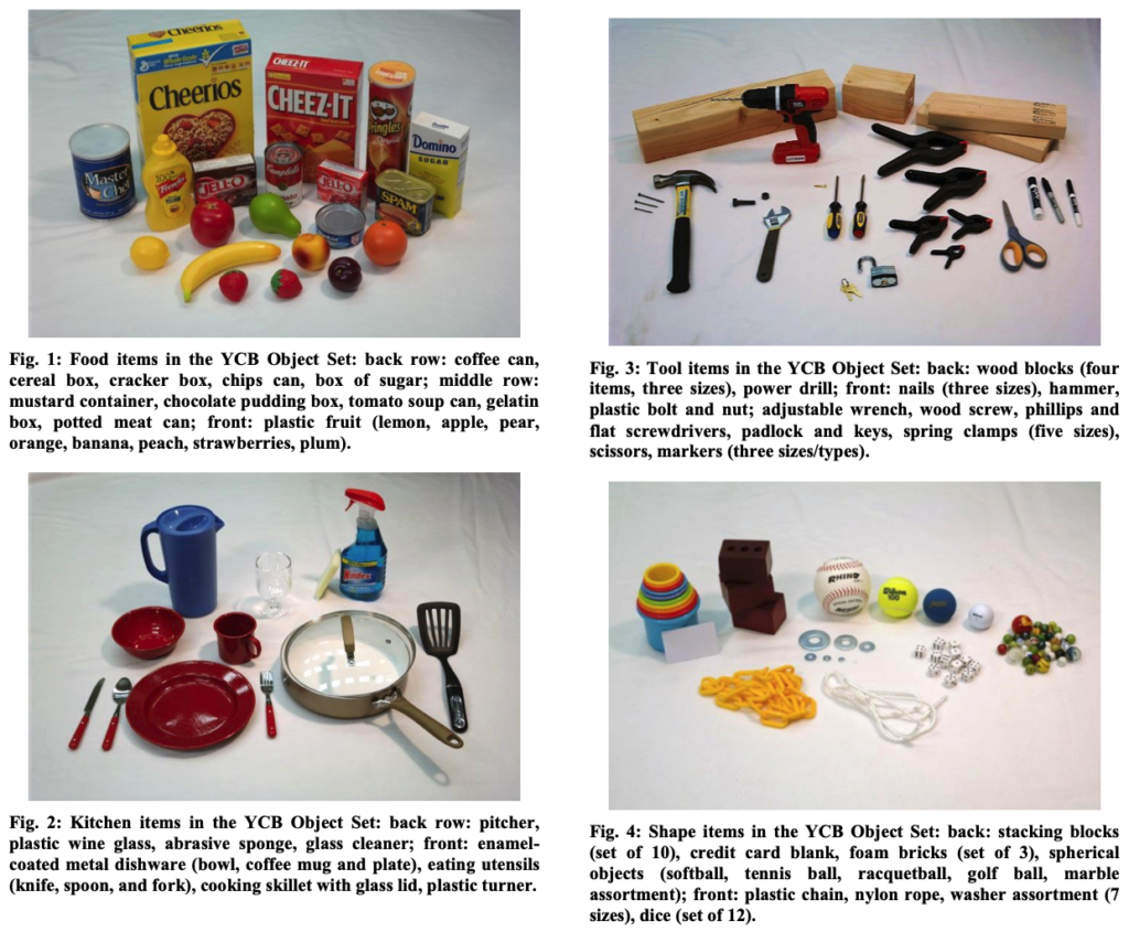 기존 6D pose estimation 테스크에서 사용되었던 YCB-V라는 데이터셋의 단일 센서가 아닌 여러 센서를 통해 취득한 데이터셋입니다. YCB는 Yale-CMU-Berkeley의 약어로 3개의 대학에서 공동으로 개발된 데이터셋이라고 하네요. YCB에 있는 물체들을 이용하여 촬영한 데이터셋을 PoseCNN의 논문에서 YCB-V를 제안하였고 6D pose estimation의 대표적인 데이터셋이라고 할 수 있습니다.