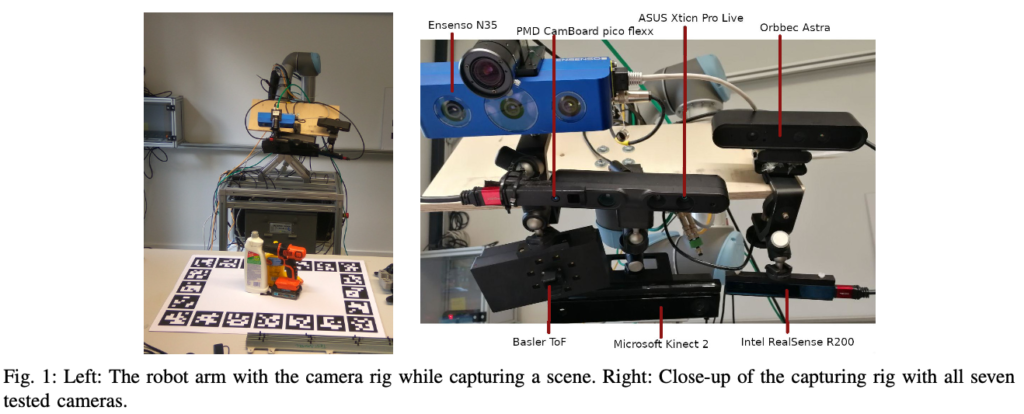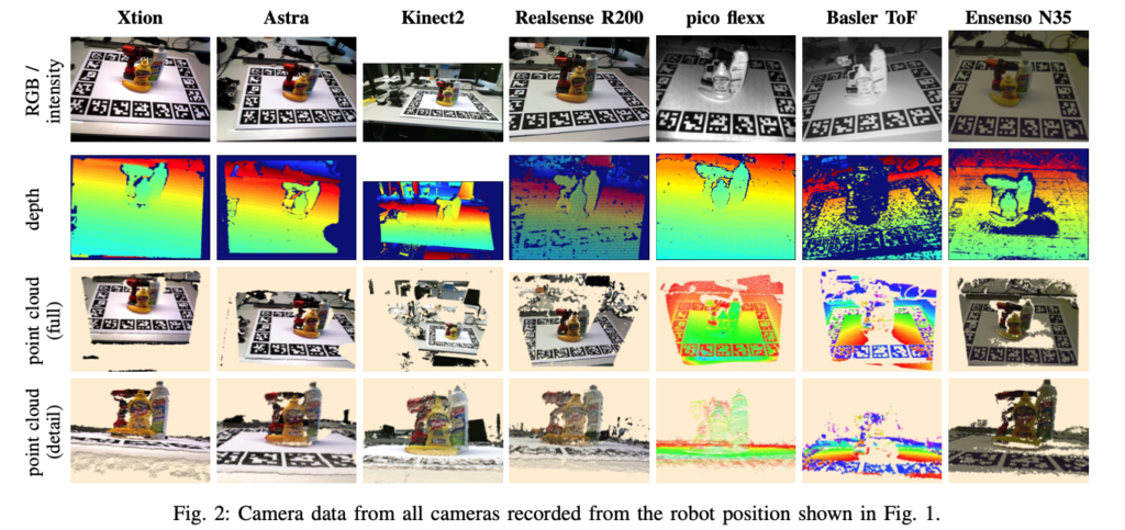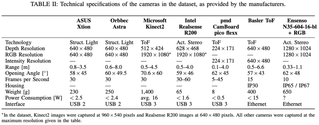 depth를 생성하는 기법에 대한 차이뿐만 아니라, range, FOV, 크기, 전력 소비 등 여러 측면에서 차이가 있습니다. 로봇이 사용되는 요구 사항이 서로 다르기 때문에 예를 들어 manipulator에는 깊이 해상도가 좋은 고해상도 RGB-D 카메라가 필요할 수 있지만, 소형 디바이스에 들어가려면 전력 소비가 적거나, 크기가 작은 센서를 필요합니다. 하지만 제조업체의 사양만으로는 적합한 카메라를 선택하기 어렵고, 여러 대의 카메라를 구입하고 설치하는 데는 많은 비용과 노동력이 소요됩니다.