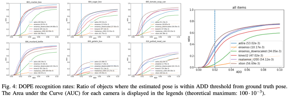 평가지표는 ADD를 사용하였으며 Basler ToF 및 pico flexx 센서는 평가에서 제외되었습니다. 그림(4)는 ADD를 계산하고 각 카메라에 대한 Area Under the Curve(AUC)을 계산한 것을 나타냅니다. 점선은 DOPE 논문과 같이 분석에 필요한 정확도를 나타내는 threshold(2cm)을 의미한다고 하네요.