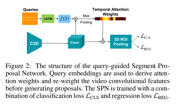 SPN은 R-C3D에서 처음 사용되었습니다. 저자는 R-C3D의 SPN은 모든 관심 있는 구간을 제안하지만, text-to-clip에서는 특정 쿼리가 주어지기 때문에 모든 관심 있는 구간이 아닌 쿼리와 관련이 있는 구간만 필요로합니다. 따라서 저자는 query-guided SPN을 제안합니다. 쿼리의 feature representation을 사용하여 SPN을 조정하고 관련 시각 영역에 집중하는 방법입니다.