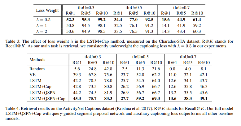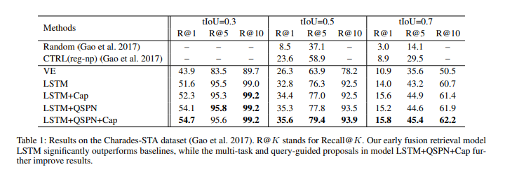 표 1의 구성은 Charades-STA 데이터셋에서의 결과를 보여주고 있습니다. VE이 CTRL 모델을 앞서는 결과를 보여주었고 그에 대한 2개의 의견을 제시합니다. 하나는 R-C3D 모델에서의 segment proposal이 더 정밀한 결과를 보여주며 두번째로는 CTRL에서 사용하는 binary classification loss보다 triplet-based loss가 더 좋은 손실함수이기 때문입니다. LSTM모델은 VE보다도 좋은 모습을 보여줍니다. 이는 VE는 ‘문을 여는’, ‘문을 다는’과 같은 문장을 헷갈려하지만 LSTM과 LSTM+QSPN+Caps 모델은 이 두가지 행동을 구분할 수 있다고 설명합니다.
