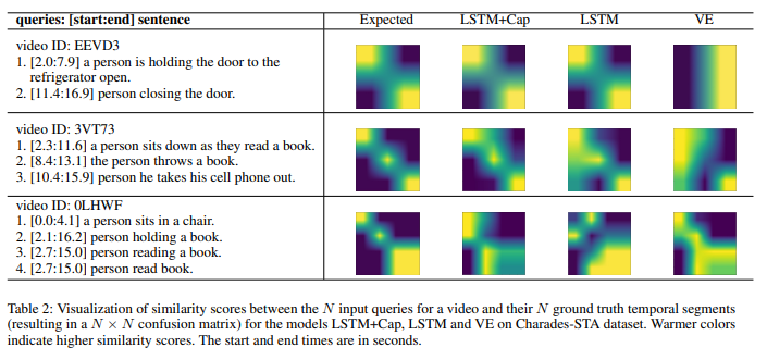 표 2 우측의 유사도맵은 N개의 인풋 쿼리와 N개의 GT 세그먼트의 유사성점수를 나타내는 confusion matrix를 시각화한 그림으로 이상적인 상황은 Expected와 같은 대각선 형태의 이미지가 나오는 것입니다. 저자는 LSTM과 VE를 비교하며 VE의 경우에는 문이 열리고 닫히는 것과 같은 반대의 액션도 헷갈려하는 모습을 보인다는 점을 지적하며 LSTM을 사용한 이유를 강조하고 있고, 추가로 캡셔닝을 넣음으로 오차를 줄이는 것을 보여줍니다.