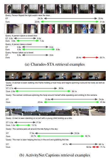 위 사진은 각각 Charades-STA 데이터셋과 ActivityNet Captions 데이터셋에 대한 정성적 결과를 보여줍니다.
